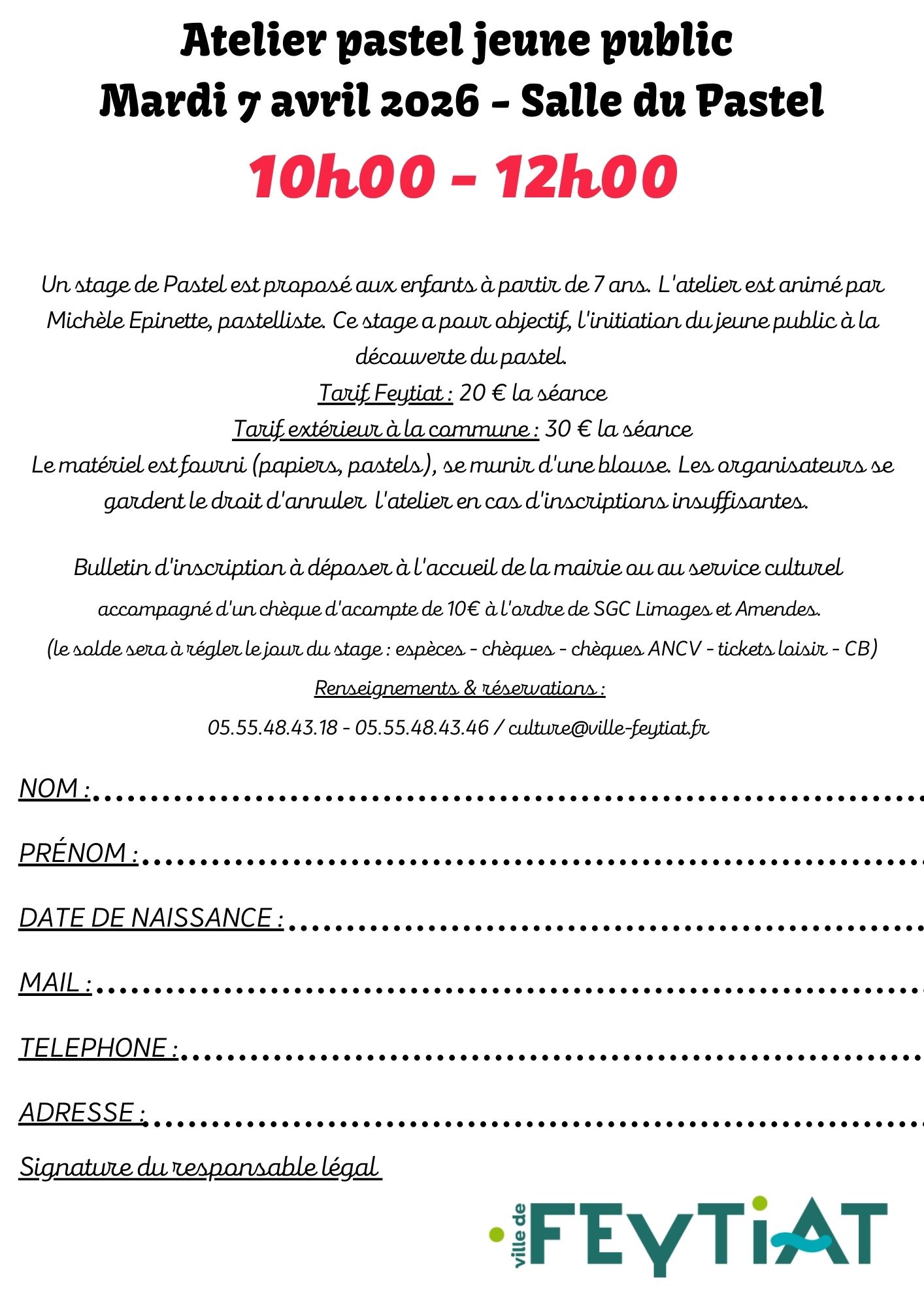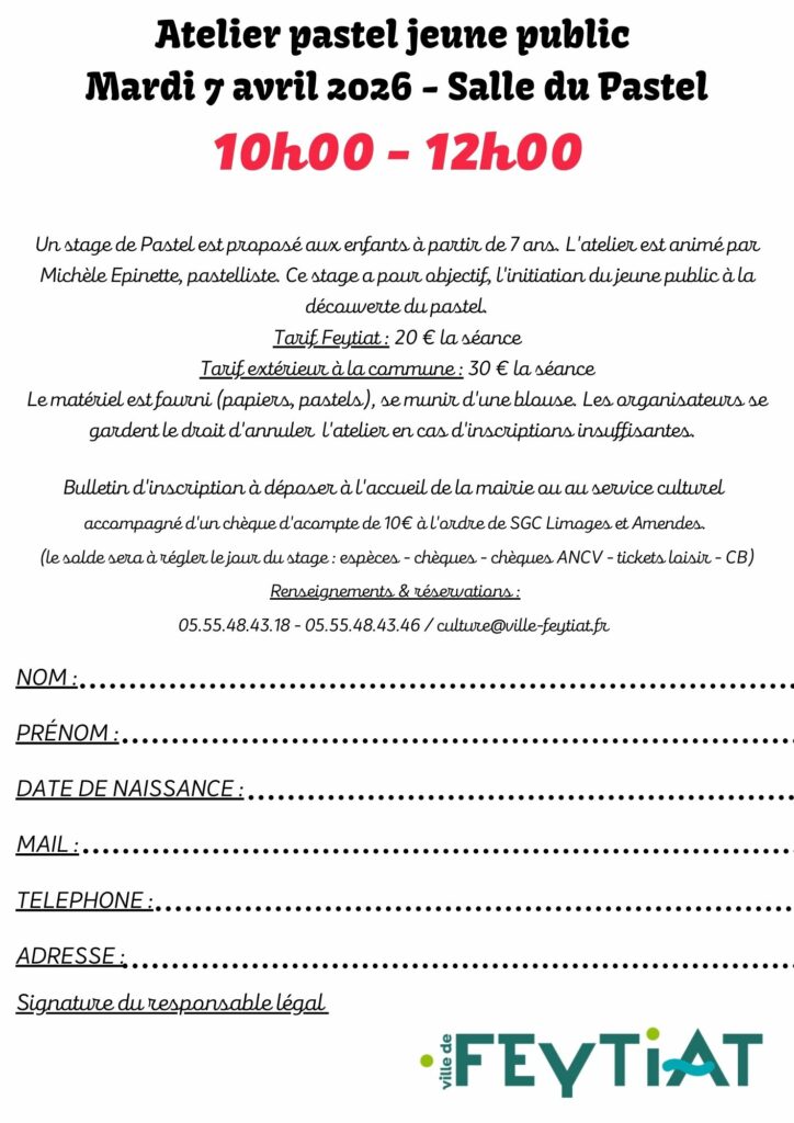 Le matériel est fourni (papiers, pastels), se munir d’une blouse. Les organisateurs se gardent le droit d’annuler l’atelier en cas d’inscriptions insuffisantes.
