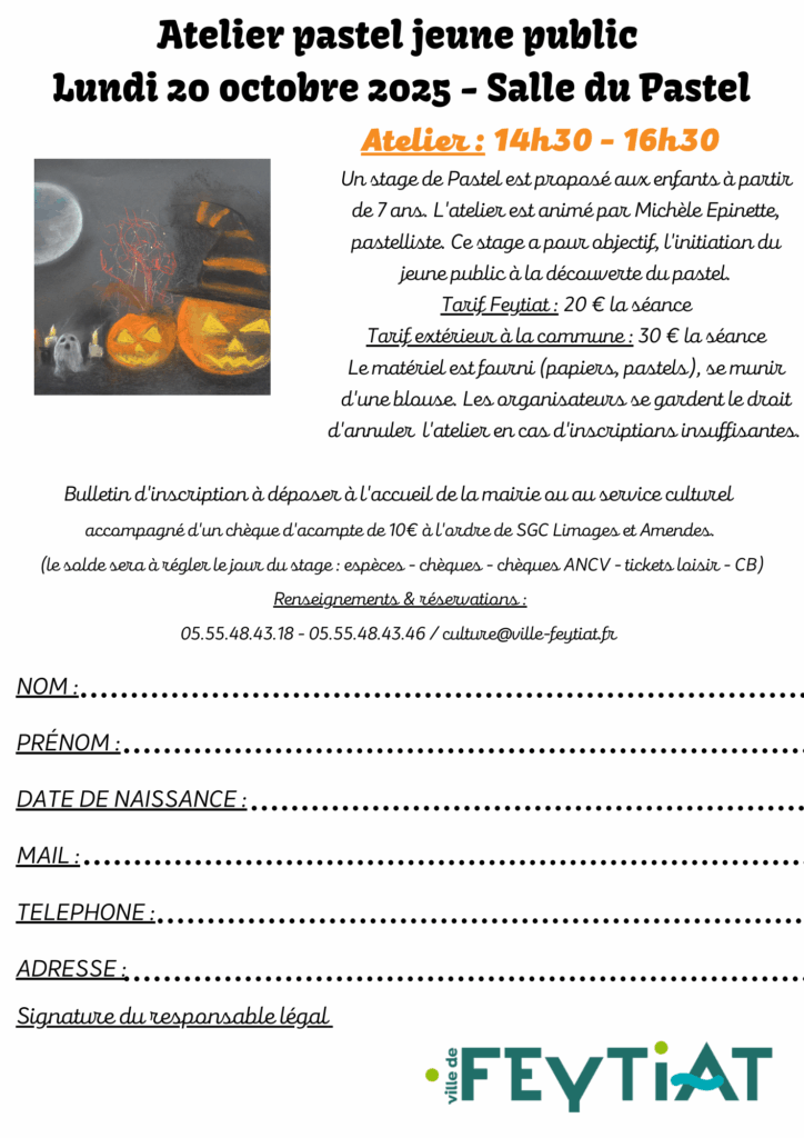 Le matériel est fourni (papiers, pastels), se munir d’une blouse. Les organisateurs se gardent le droit d’annuler l’atelier en cas d’inscriptions insuffisantes.